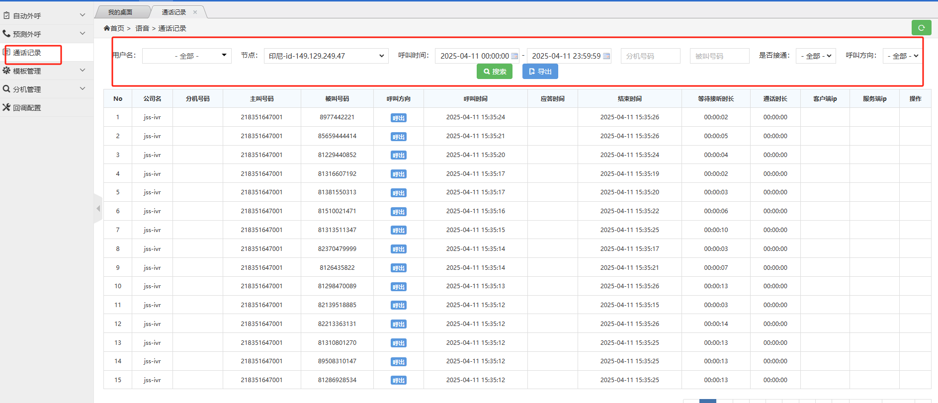 目录 搜索 展开 语音业务概览SIP Trunk及VOIP业务概览号段及路由信令及返回码常见名词及指标呼叫中心操作开户查询VOS系统操作开户查询信令查看故障排查SIP Trunk常见错误码 暂无相关搜索结果! 查询 通话记录查询路径登录管理后台 → 通话记录-呼叫时间(选择需要查看的日期)-搜索作者:admin 创建时间:2025-04-10 10:04最后编辑:11111 更新时间:2025-04-14 16:02 Infinity links AI助理 X 我是您的AI小助手,有什么不清楚的您可以问我哦!